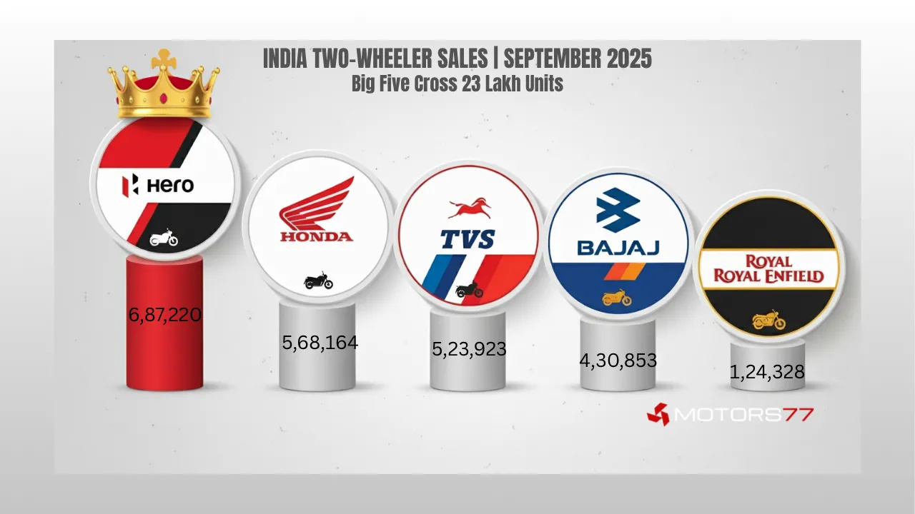 Festive tailwinds and price resets delivered a big September for India’s two-wheelers. The Big Five together crossed 23 lakh units, with Hero comfortably in the lead, Honda holding No.2, TVS closing fast, Bajaj steady but export-skewed, and Royal Enfield posting its best month ever. Pent-up demand, improved financing, and pre-festive stock build-up helped lift volumes across segments. Commuter motorcycles anchored the surge, while scooters added momentum in urban pockets. Premium bikes—especially sub-350cc variants—surprised with sustained traction, signaling a broadening aspirational base even as affordability remained the primary driver nationwide.