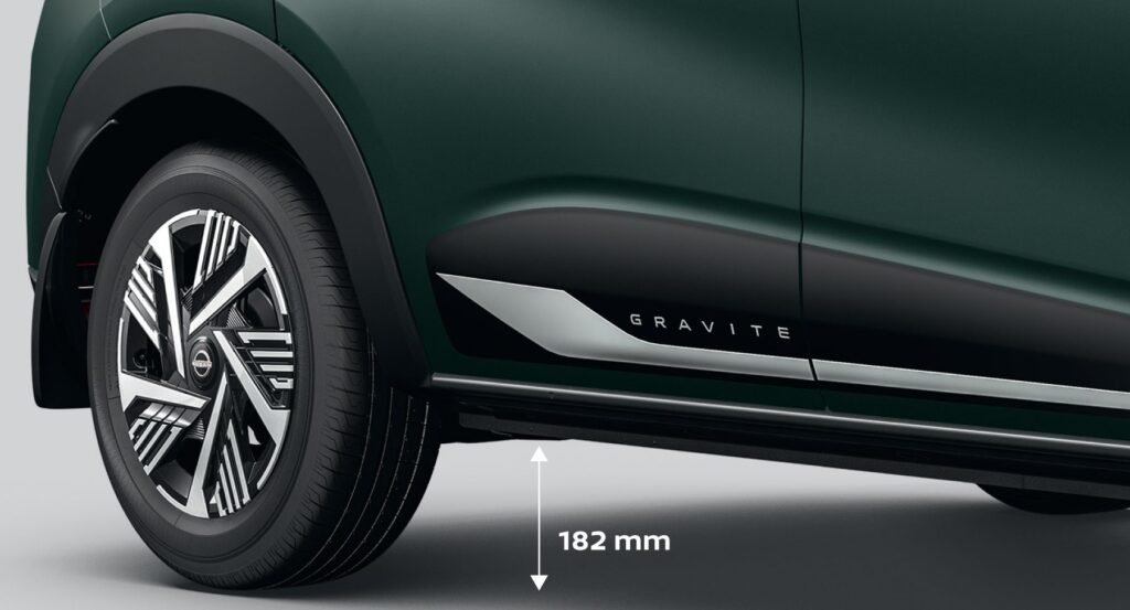 The exterior establishes distinct identity despite sharing foundation with the Renault Triber. The front fascia features Nissan’s signature V-Motion grille with honeycomb mesh detailing. Prominent GRAVITE lettering adorns both bonnet and tailgate.