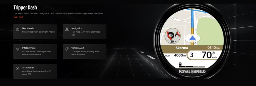 The Tripper navigation system represents a first for Royal Enfield motorcycles. Riders can view full route maps, traffic data, and turn by turn instructions directly on the console. Day and night modes switch automatically based on ambient lighting conditions.
