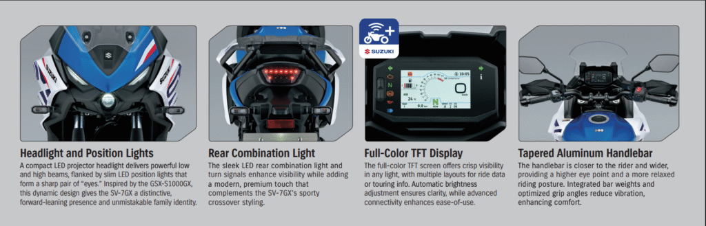 Weight and Dimensions: At 211 kg, the SV-7GX matches or undercuts most competitors while maintaining the 17.4-liter fuel capacity and 795mm seat height that balance accessibility with capability. The 1,445mm wheelbase positions between sport-focused and touring-optimized alternatives.
