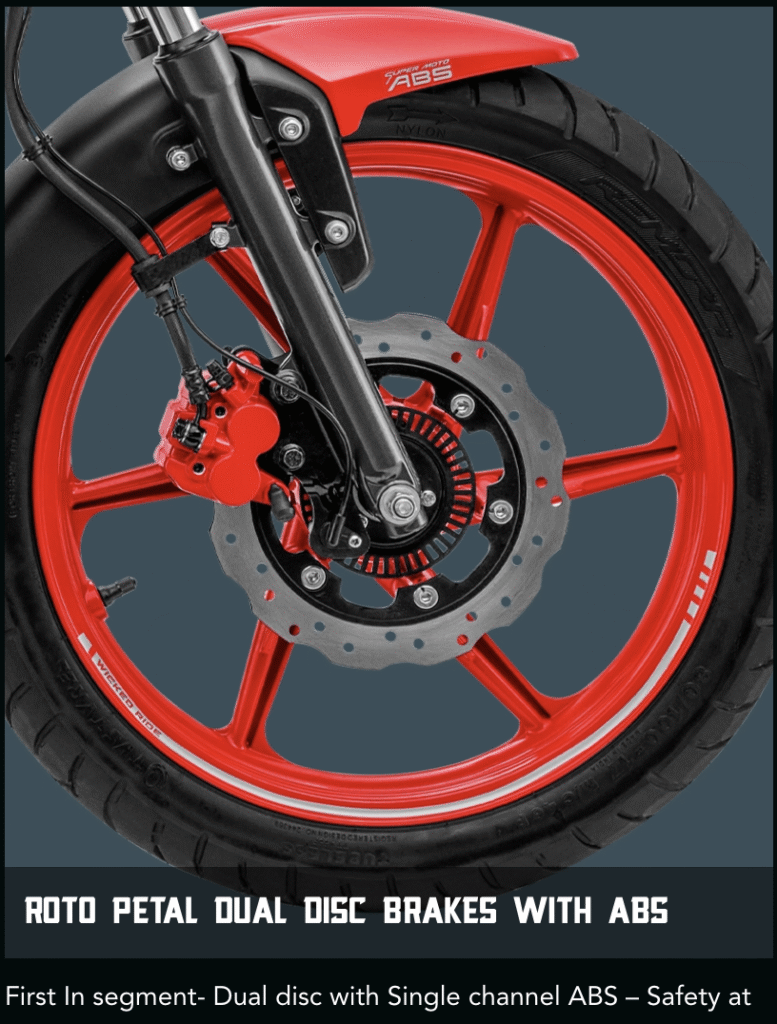 The 2025 TVS Raider 125 becomes the first motorcycle in its 125cc class to offer a rear disc brake, giving it a distinctive edge over rivals. The updated model features dual petal-type disc brakes with red calipers at both ends, paired with single-channel Super Moto ABS for enhanced safety and braking performance.